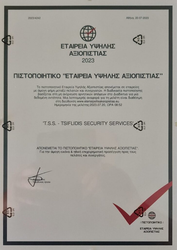 T.S.S. – TSIFLIDIS SECURITY SERVICES, Εταιρεία Υψηλής Αξιοπιστίας