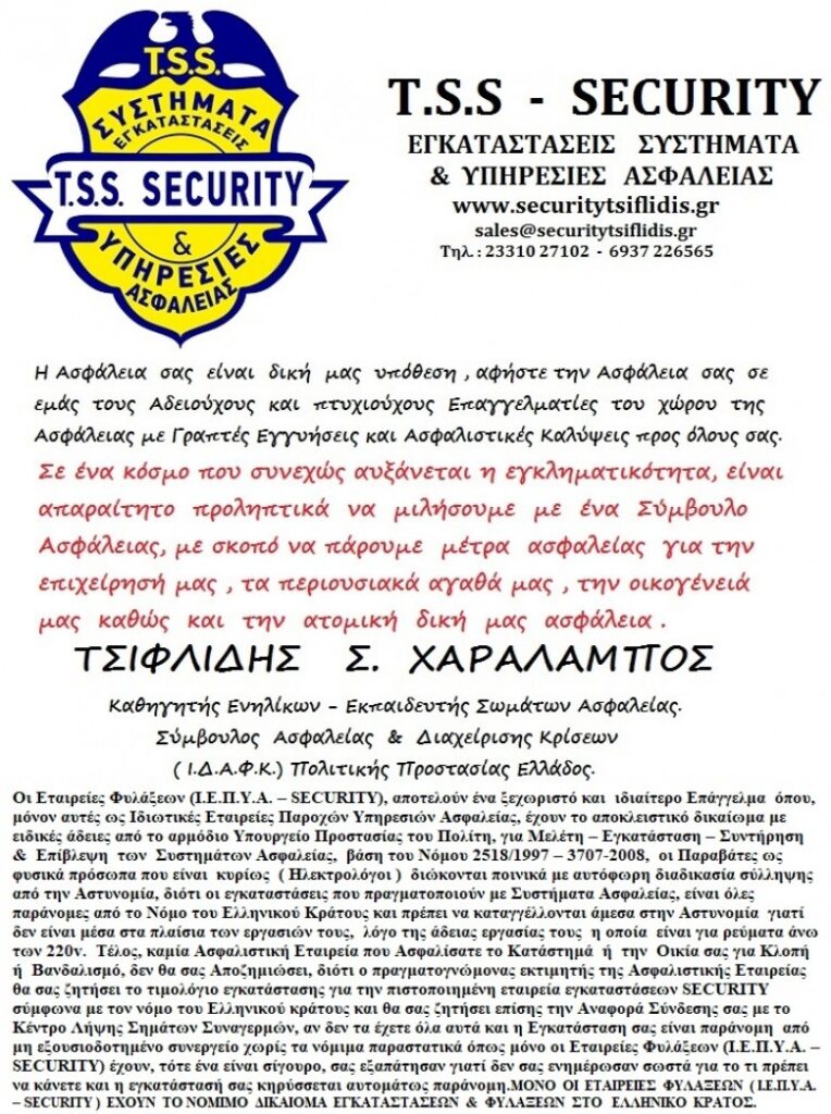 T.S.S. – TSIFLIDIS SECURITY SERVICES, ΣΕΚΙΟΥΡΙΤΥ, ΗΜΑΘΙΑ, ΒΟΡΕΙΟ ΕΛΛΑΔΑ, ΣΥΣΤΗΜΑΤΑ ΑΣΦΑΛΕΙΑΣ, ΦΥΛΑΞΕΙΣ.