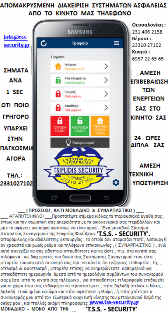ΣΥΝΑΓΕΡΜΟΙ , ALARM , ΑΠΟ ΤΗΝ ‘T.S.S. – SECURITY’ ΈΞΥΠΝΟ Σύστημα Συναγερμού με Απομακρυσμένη Διαχείριση, με ειδοποίηση εντός ( 1 second) ενός δευτερολέπτου μέσο της κινητής τηλεφωνίας, ταυτόχρονα προς όλους τους χρήστες του Συναγερμού σας μαζί. Καλέστε μας σήμερα κιόλας, για να κάνουμε μία μελέτη στον δικό σας χώρο. www.tss-security.gr – info@tss-security.gr – Θεσσαλονίκη : 231 406 2158 – Βέροια : […]