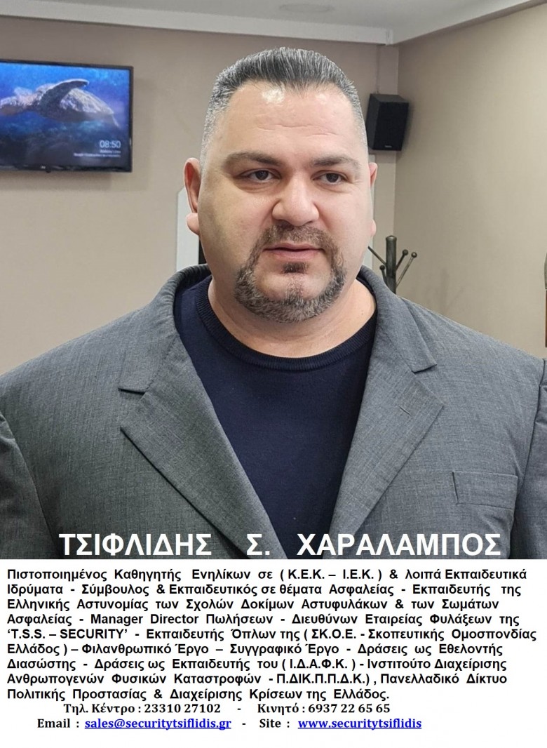 ΤΣΙΦΛΙΔΗΣ Σ. ΧΑΡΑΛΑΜΠΟΣ Καθηγητής Ενηλίκων σε (Κ.Ε.Κ. & Ι.Ε.Κ.) – Σύμβουλος & Εκπαιδευτής σε θέματα Ασφαλείας – Εκπαιδευτής, Καθηγητής