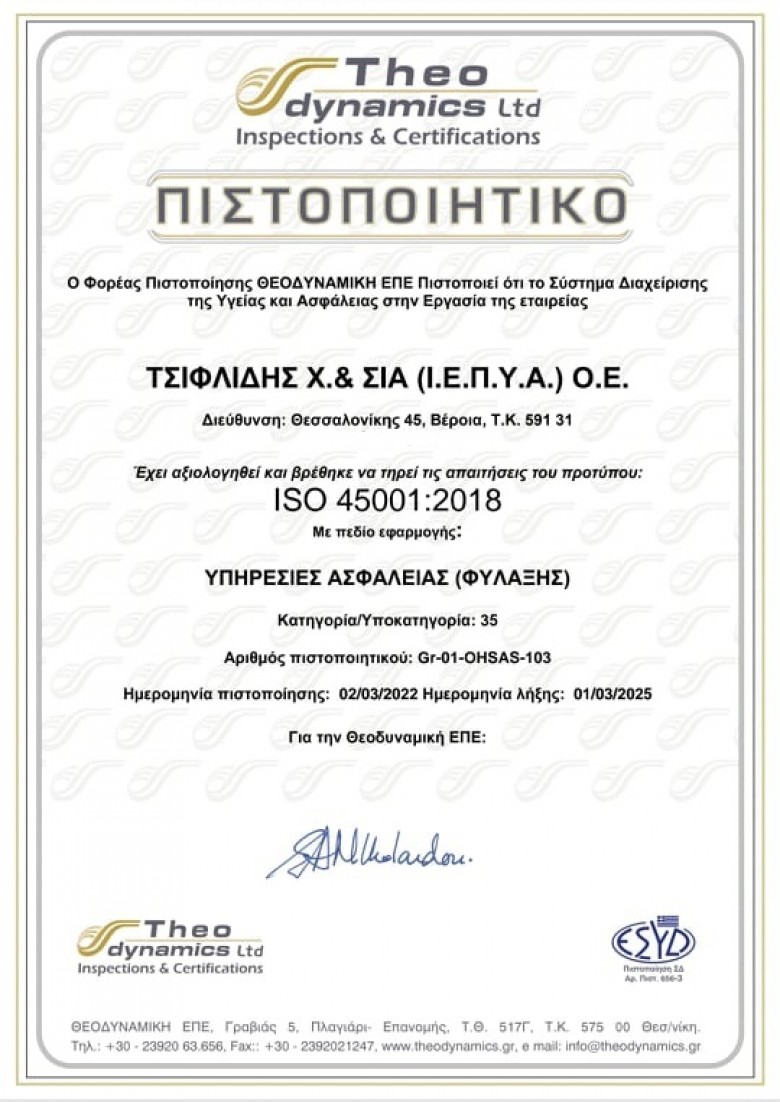 Πιστοποιημένη με ( I.S.O.) 45001 : 2018 Εταιρεία Φυλάξεων __ ”T.S.S. – TSIFLIDIS SECURITY SERVICES”
