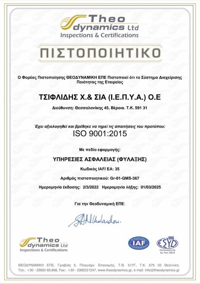 Πιστοποιημένη με ( I.S.O.) 9001 : 2015 Εταιρεία Φυλάξεων __ ”T.S.S. – TSIFLIDIS SECURITY SERVICES”