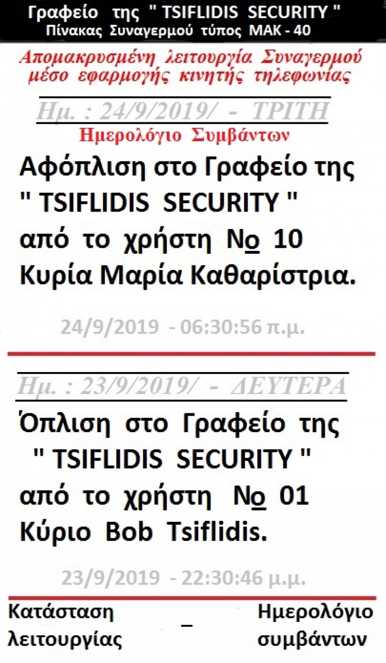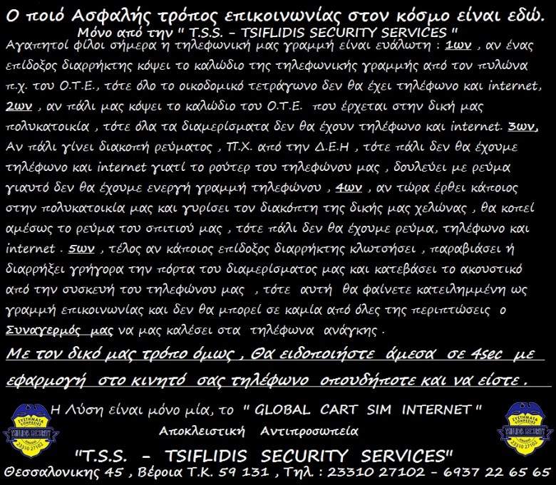 Ο ποιό Ασφαλής και γρηγορότερος τρόπος επικοινωνίας του Συναγερμού σας είναι εδώ . Έξυπνες λύσεις , μόνο για πραγματικά ψαγμένους ανθρώπους . __ ΤΣΙΦΛΙΔΗΣ _ Σ. _ ΧΑΡΑΛΑΜΠΟΣ __ ΕΚΠΑΙΔΕΥΤΙΚΟΣ __ ” TSIFLIDIS SECURITY SERVICES – T.S.S.”