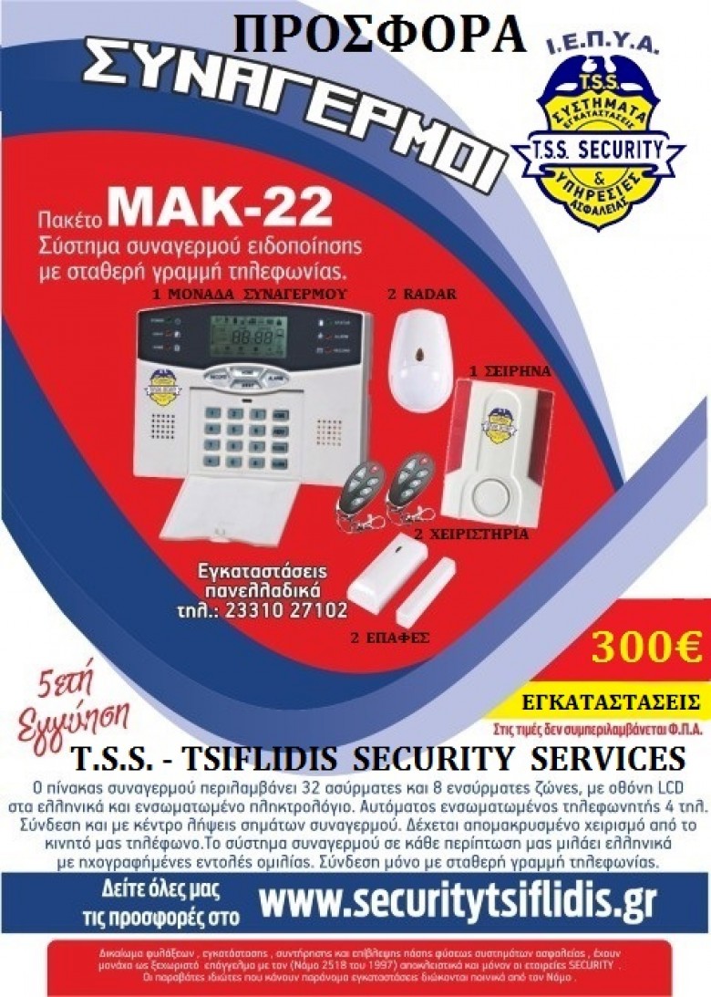 ΣΥΝΑΓΕΡΜΟΙ ΣΕ ΒΕΡΟΙΑ, ΝΑΟΥΣΑ, ΑΛΕΞΑΝΔΡΕΙΑ, ΗΜΑΘΙΑ, ΜΑΚΕΔΟΝΕΙΑ, T.S.S. – TSIFLIDIS SECURITY SERVICES ‘T.S.S. – SECURITY’ – ΣΥΣΤΗΜΑΤΑ, ΕΓΚΑΤΑΣΤΑΣΕΙΣ &