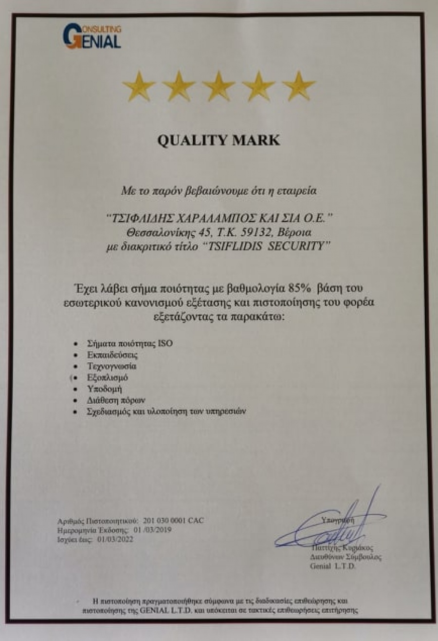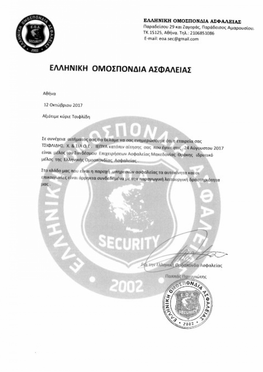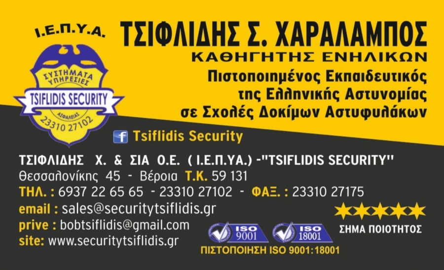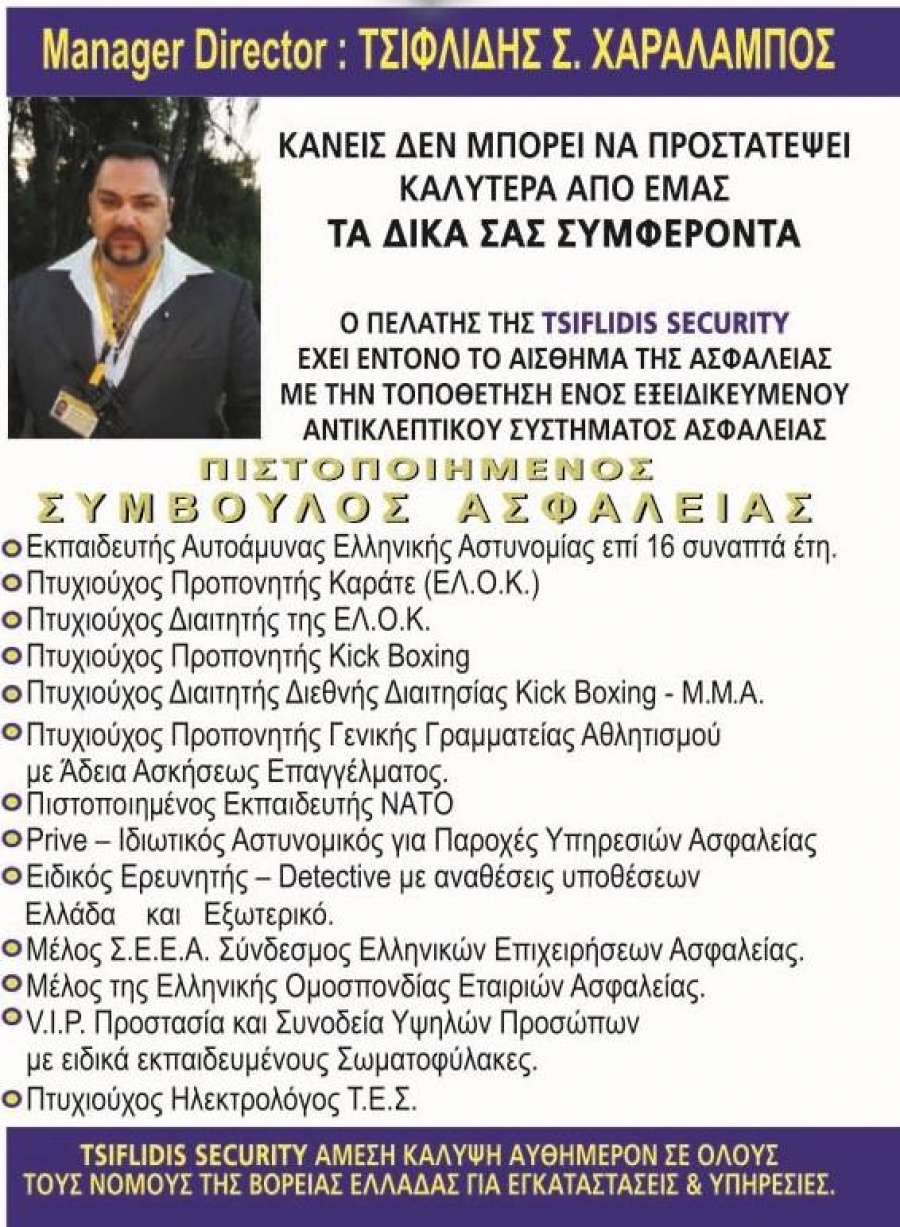 Η Εταιρία “T.S.S.-SECURITY” είναι μια Εταιρία που σκοπό έχει την Ασφάλεια σε όλα τα επίπεδα. Εμπορεύεται Συστήματα Ασφαλείας και Σκοπό έχει την Μελέτη, Εγκατάσταση, Συντήρηση και Επίβλεψη των Συστημάτων Ασφαλείας σε όλη την Ελληνική Επικράτεια.